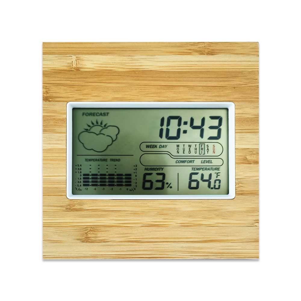 Multi-Function Bamboo Digital Clock with Weather Forecast, Calendar, Alarm, Temperature ( “Your Brand • Your Print • Your Style.” ) All printing available
